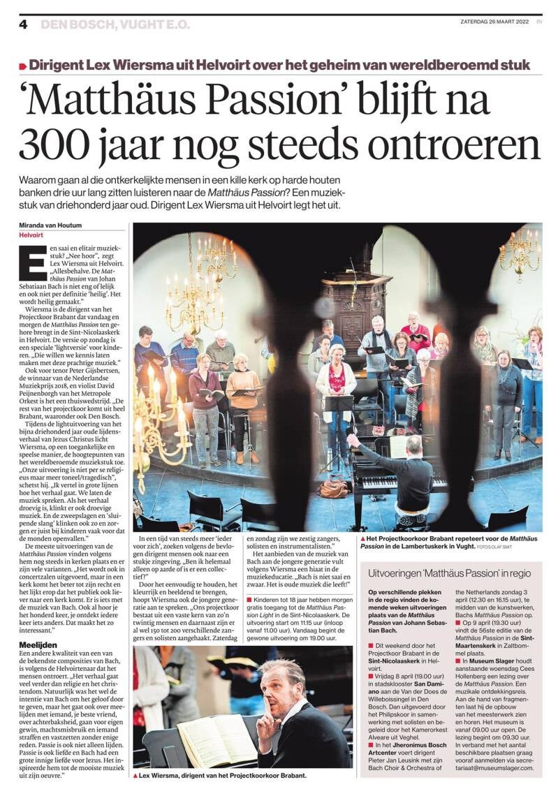 Speciaal voor kinderen en iedereen die meer wilde weten over de Matthäus Passion was er op zondag 27 maart 2022 een Matthäus Passion Light. In ruim een uur nam dirigent Lex Wiersma de luisteraars mee op reis door Bach's interpretatie van het lijdensverhaal door Matthäus. De hoogtepunten van het werk werden nader toegelicht en uitgevoerd door Projectkoor Brabant en een instrumentaal ensemble van het Zuid-Nederlands Begeleidingsorkest. Een bijzondere gelegenheid om van deze fantastische muziek te genieten, maar ook een mooie gelegenheid voor kinderen, jongeren en 'first timers' om kennis te maken met deze muziek.